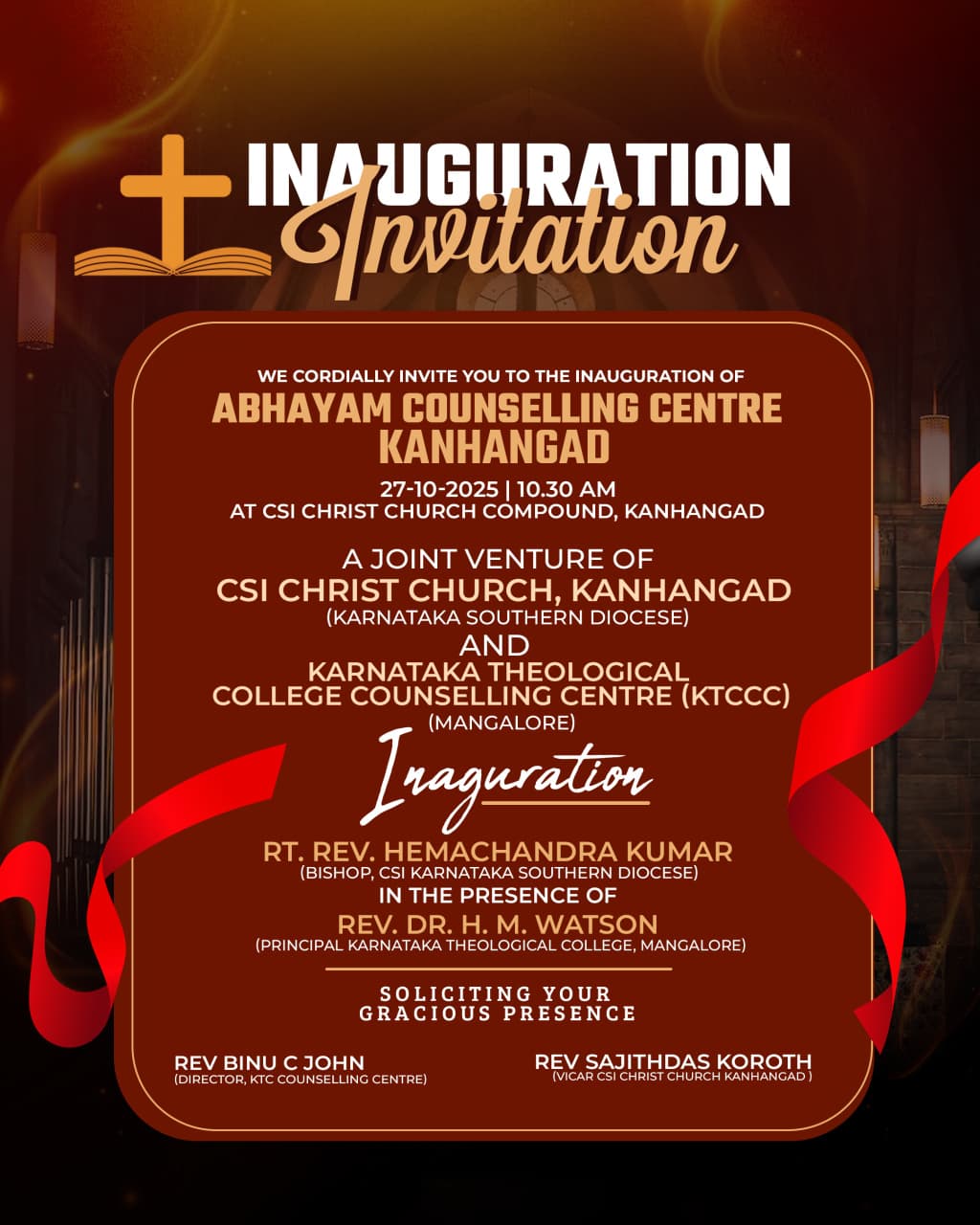The Abhayam Counselling Centre, a joint venture of KTC Counselling Centre, Mangalore, and CSI Christ Church, Kanhangad, was inaugurated on 27th October 2025 at the CSI Christ Church compound, Kanhangad. The centre was established to promote mental health, emotional well-being, and holistic pastoral care in the community. The ceremony began with an opening song by the Church Choir, followed by a welcome and prayer by Rev. Sajithdas Koroth. Rev. Binu C. John introduced the guests, and Rev. Dr. H. M. Watson, Principal of Karnataka Theological College, presented an overview of the centre’s vision and mission.