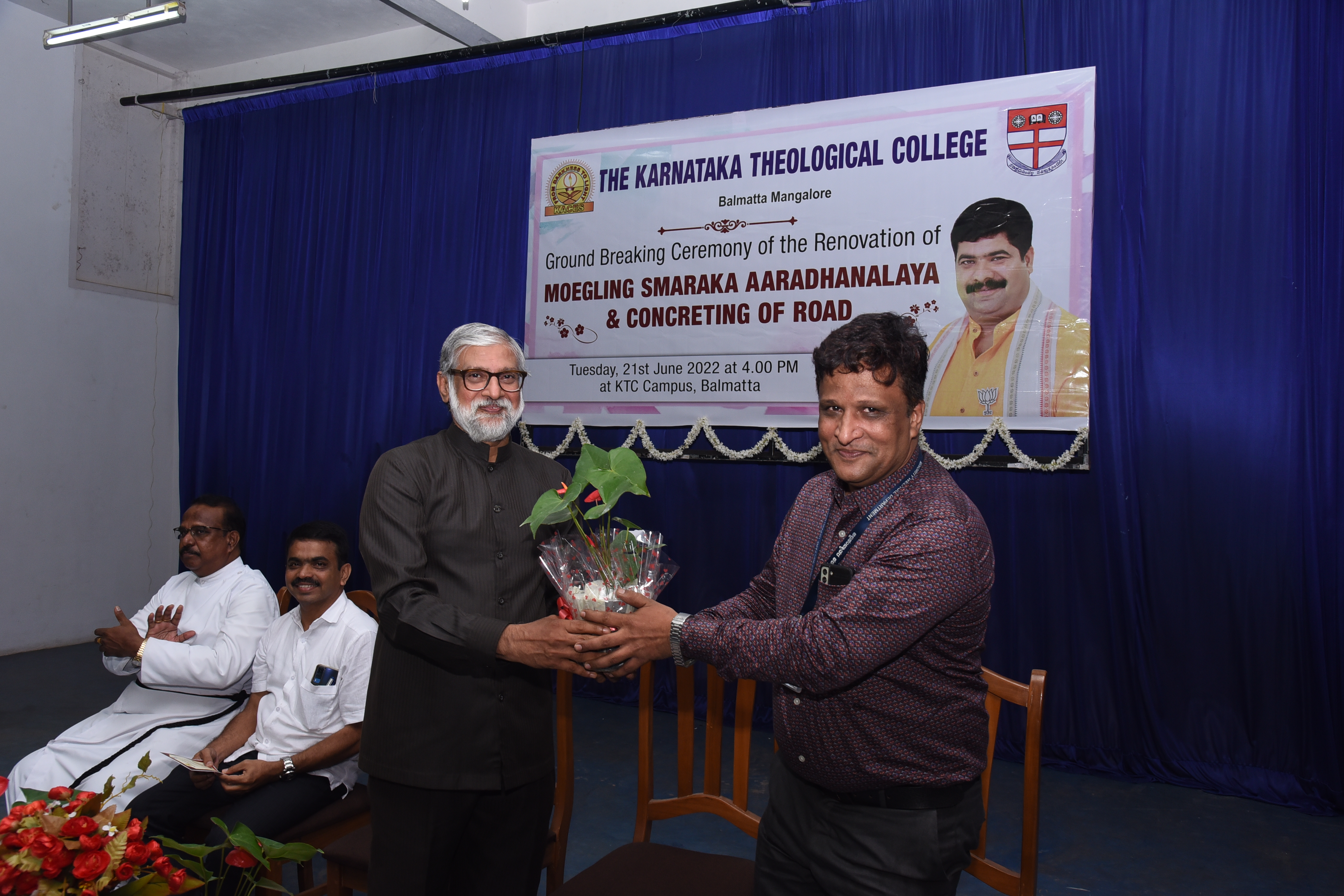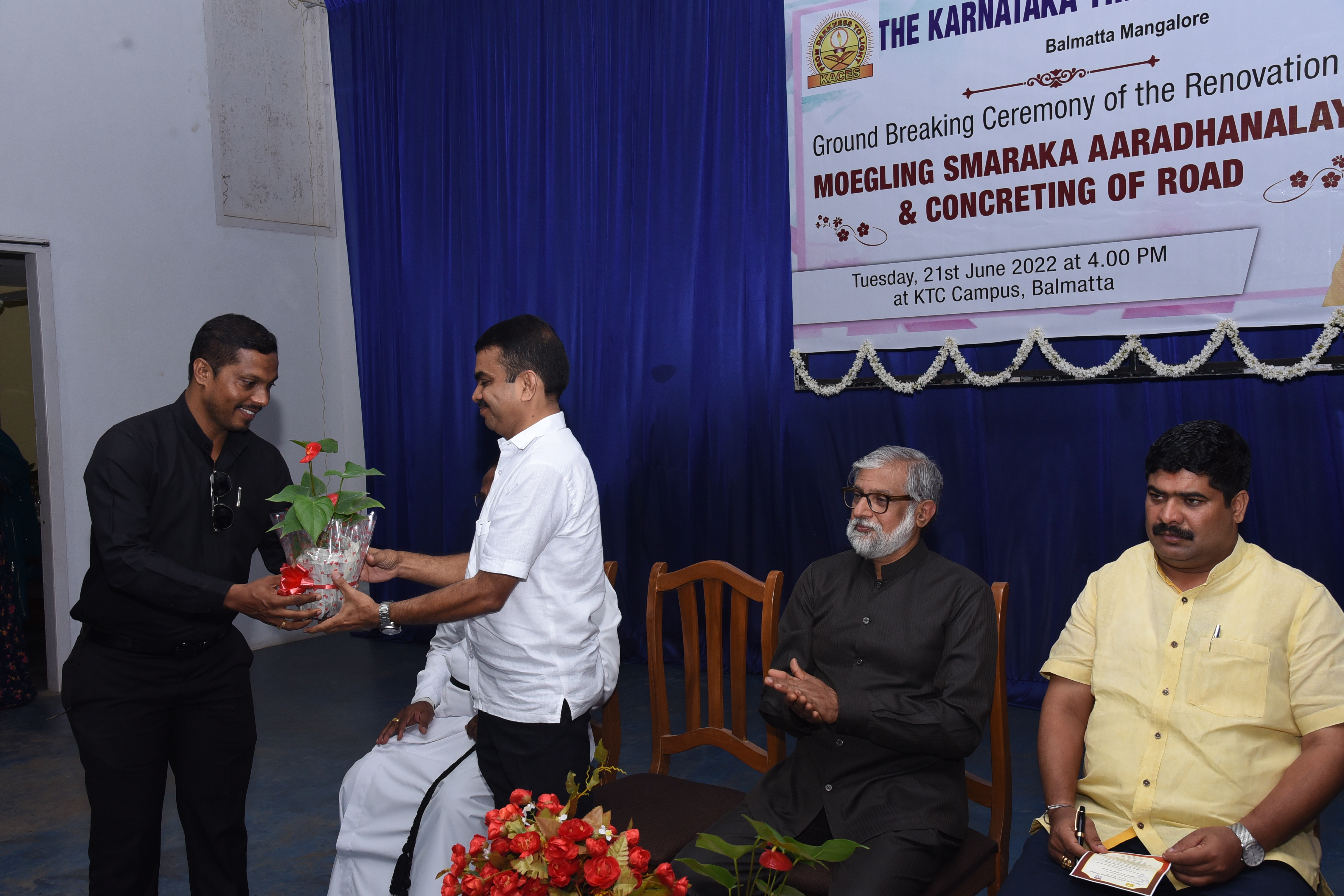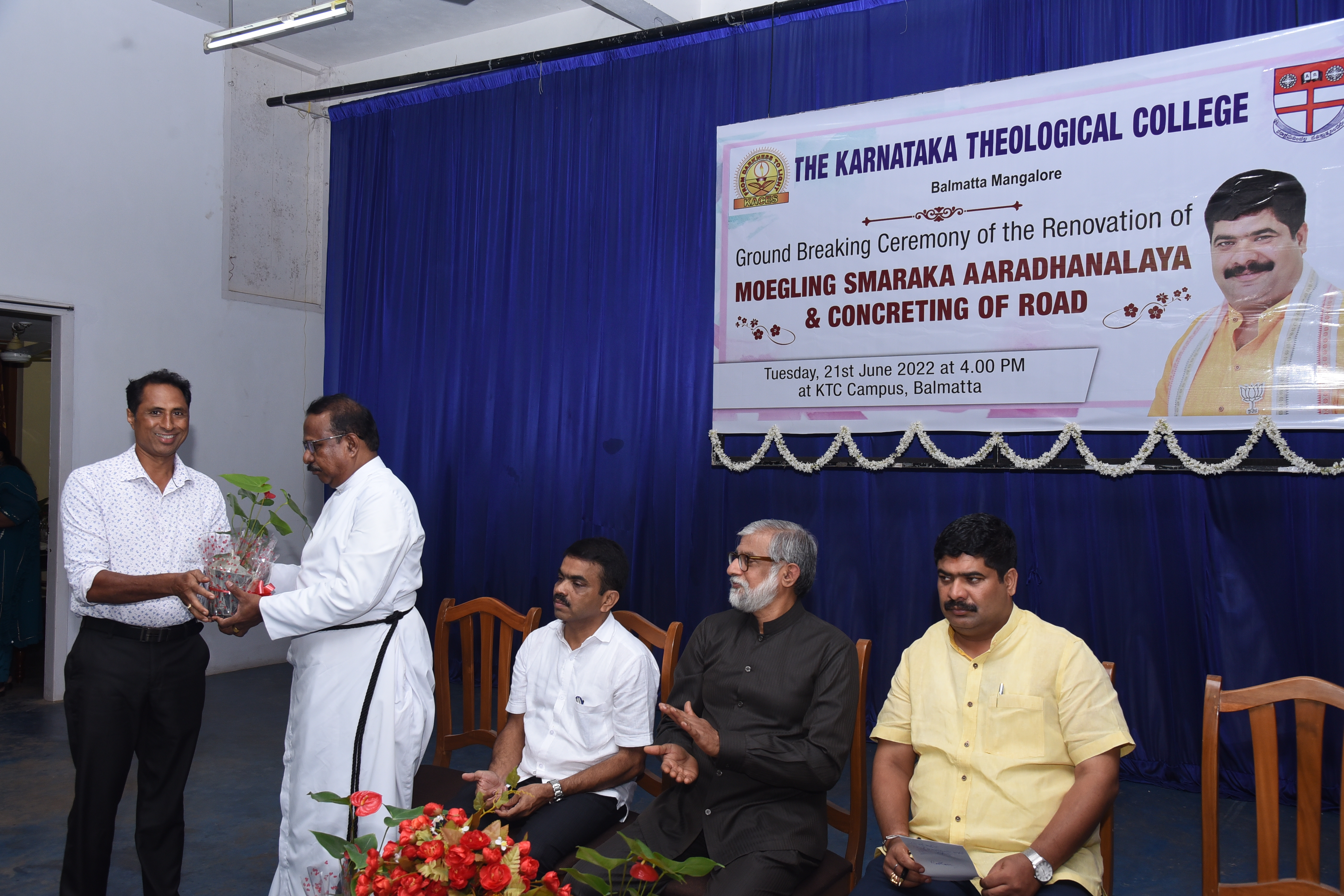 The Ground Breaking Ceremony of the Renovation of Moegling Smaraka Aaradhanalaya and the Concreting of Road was held on Tuesday, 21st June 2022. SrI D. Vedavyas Kamat, Honourable MLA, Mangalore City South Constituency was the Chief Guest. Mr. Premananda Shetty, Honourable Mayer, Mangalore City Corporation, Mr. Naveen D Souza, Corporator, Bendur Ward, Mr. Anjanappa S. Distric Officer, Minority Welfare Department, DK, Mr. Manjunath R. Miority Extension Officer, DK, and Rev. M. Prabhuraj, Area Chairman, DK were the Guests of Honour. Rev. Dr. Hubert M. Watson, Principal, KTC/Secretary, KACES presided over the function.